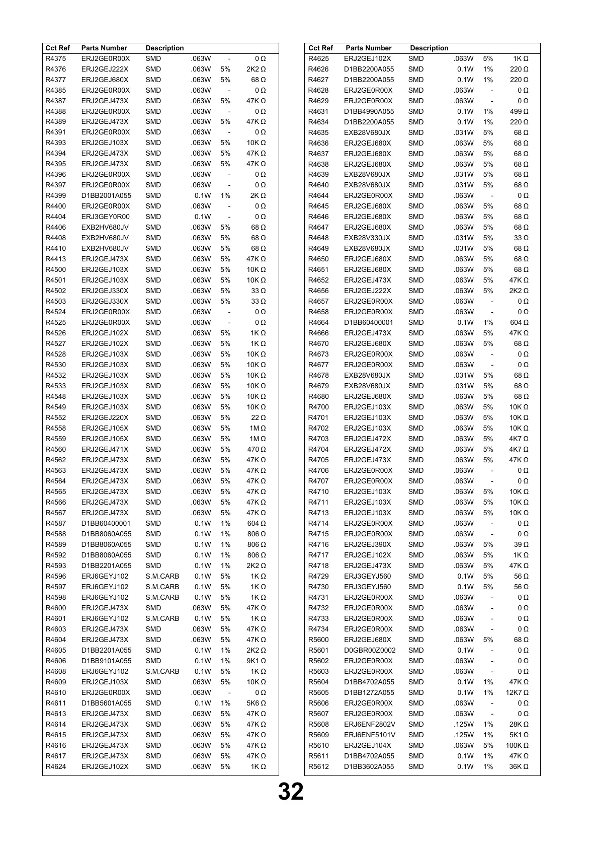 DescriptionCct Ref Parts Number DescriptionCct Ref Parts Number