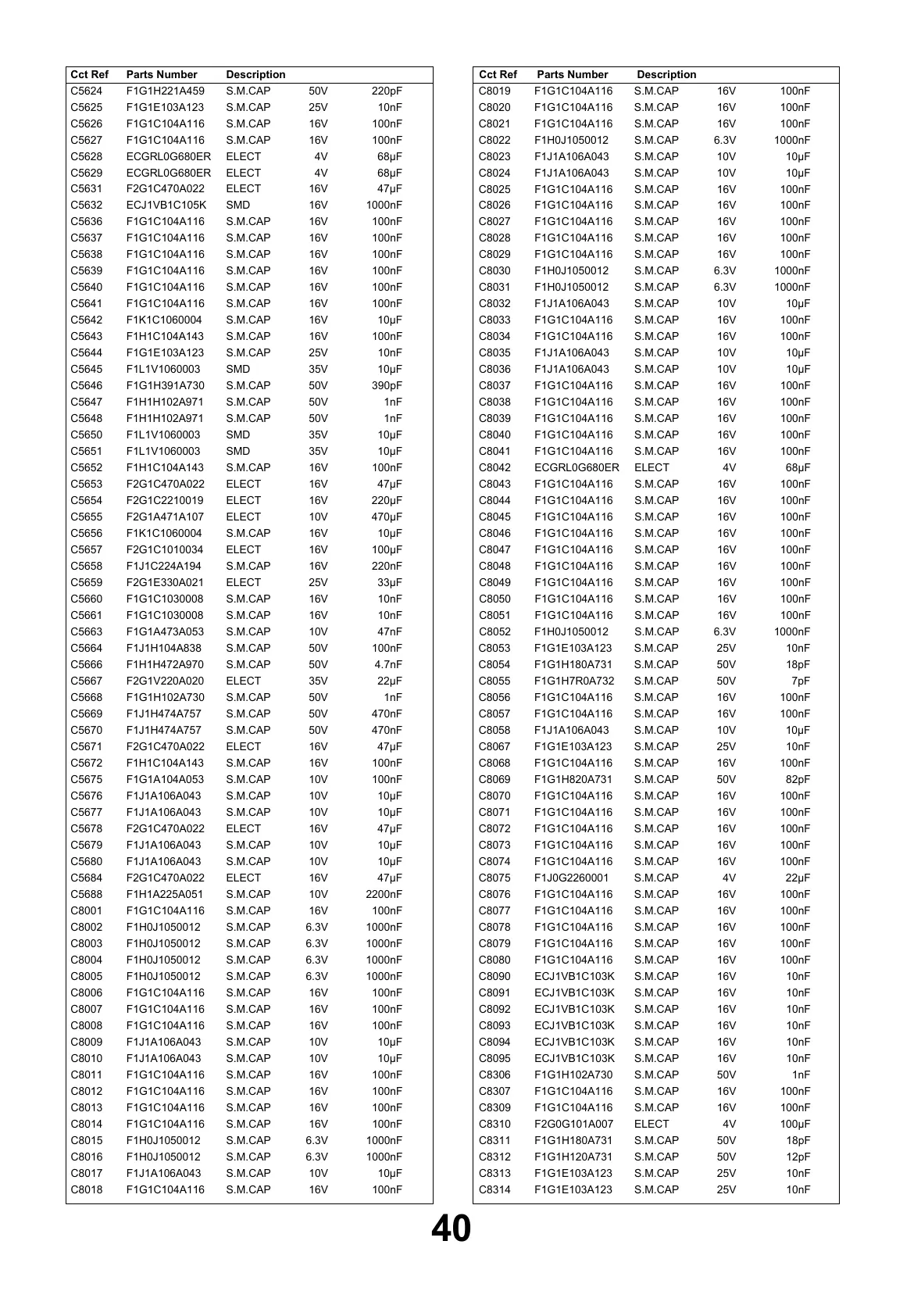DescriptionCct Ref Parts Number DescriptionCct Ref Parts Number