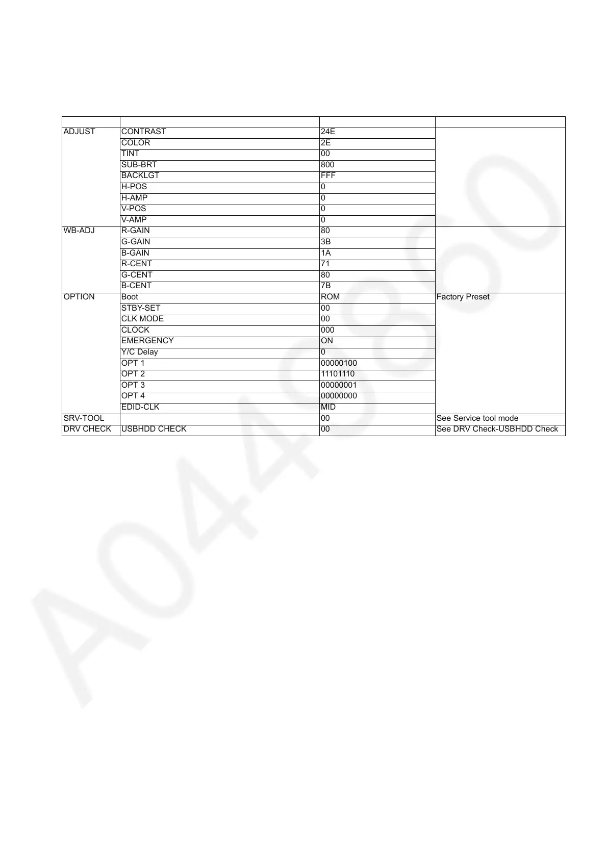 • After entering the adjustment mode, take note of the value in each item before starting adjustment.