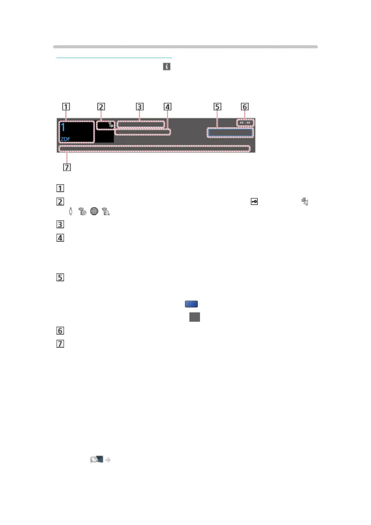 Channel type (Radio, HDTV, etc.) / Encrypted channel ( ) / TV mode ( ,