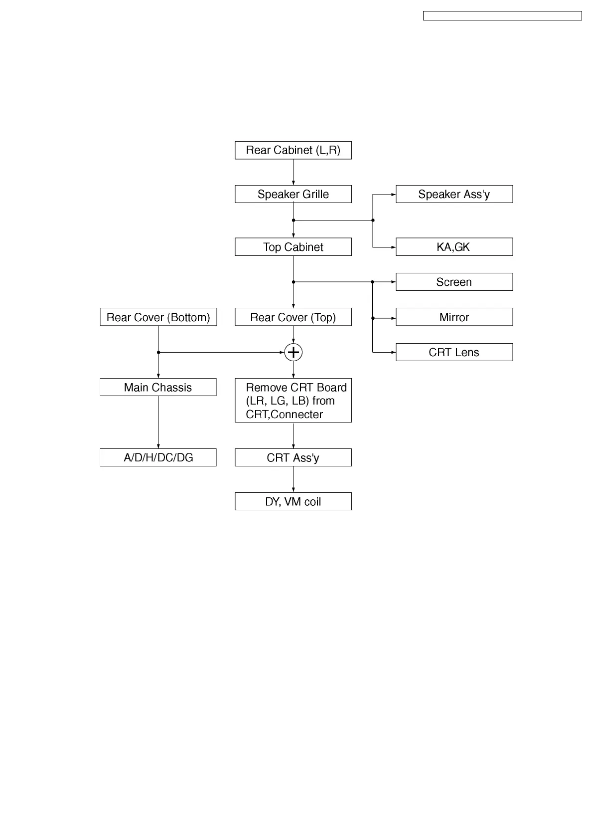 This flowchart indicates disassembly items of the cabinet parts and circuit boards in order to find the items necessary for
