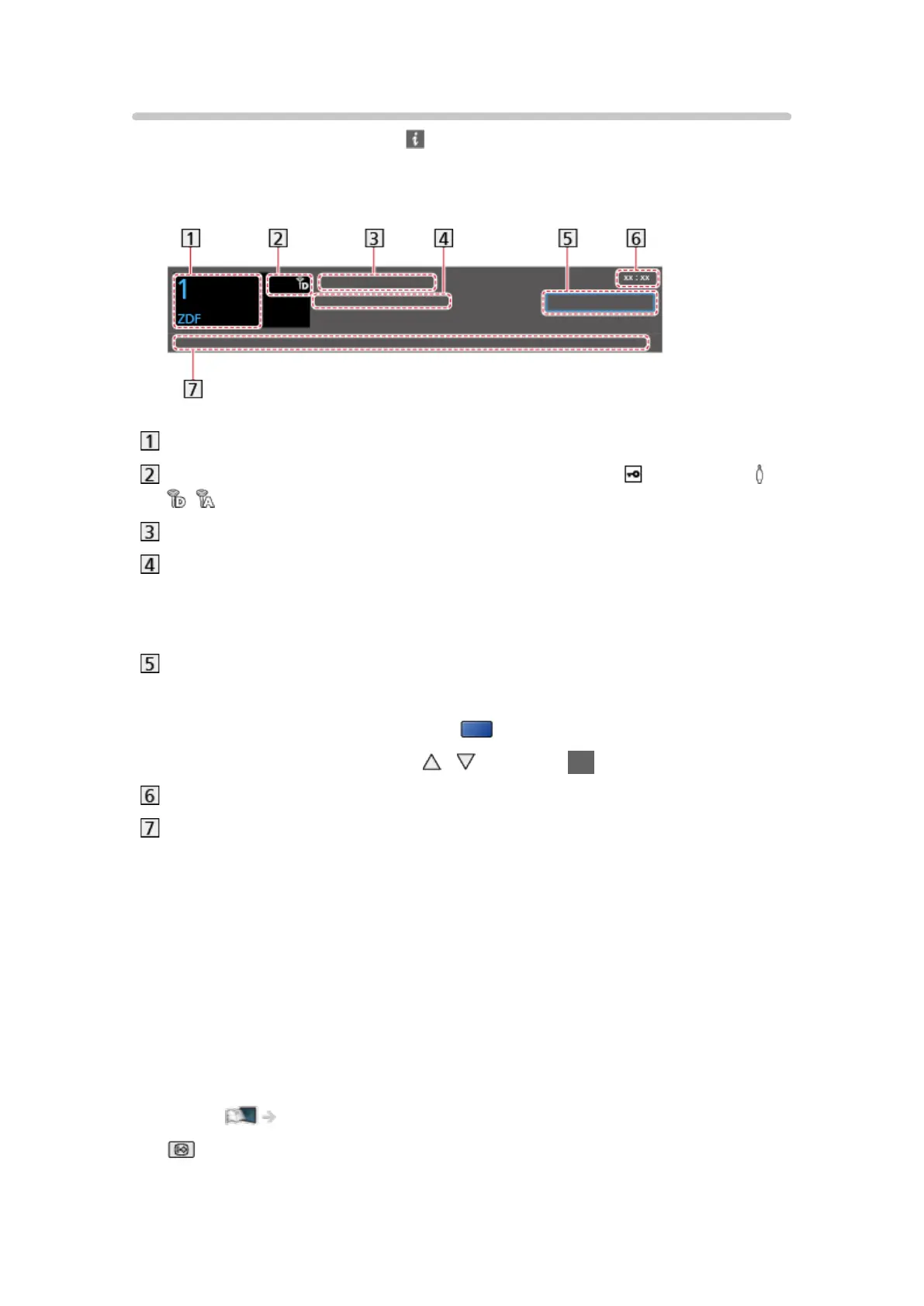 Channel type (Radio, HDTV, etc.) / Encrypted channel ( ) / TV mode ( ,
