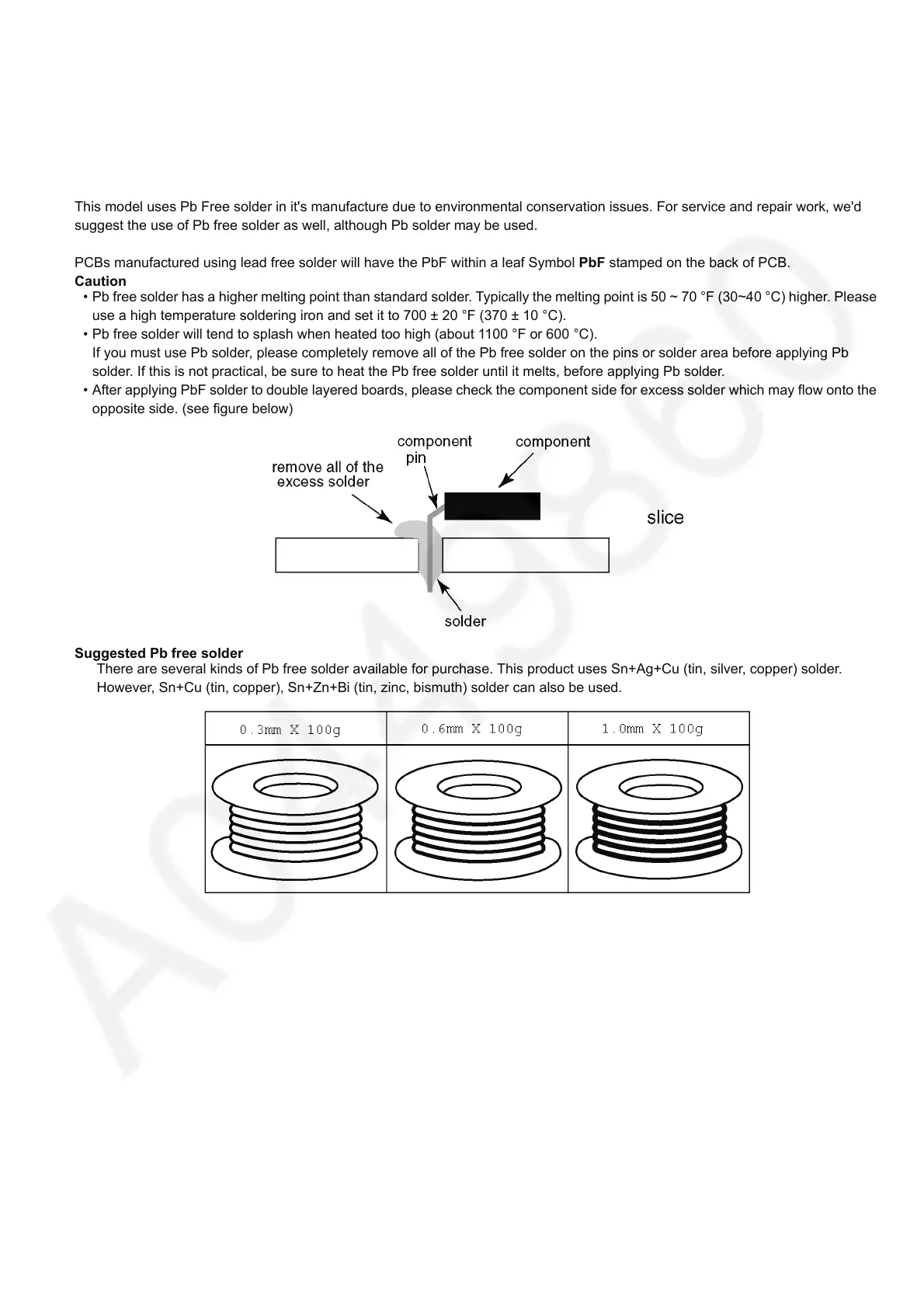 After applying PbF solder to double layered boards, please check the component side for excess solder which may flow onto the