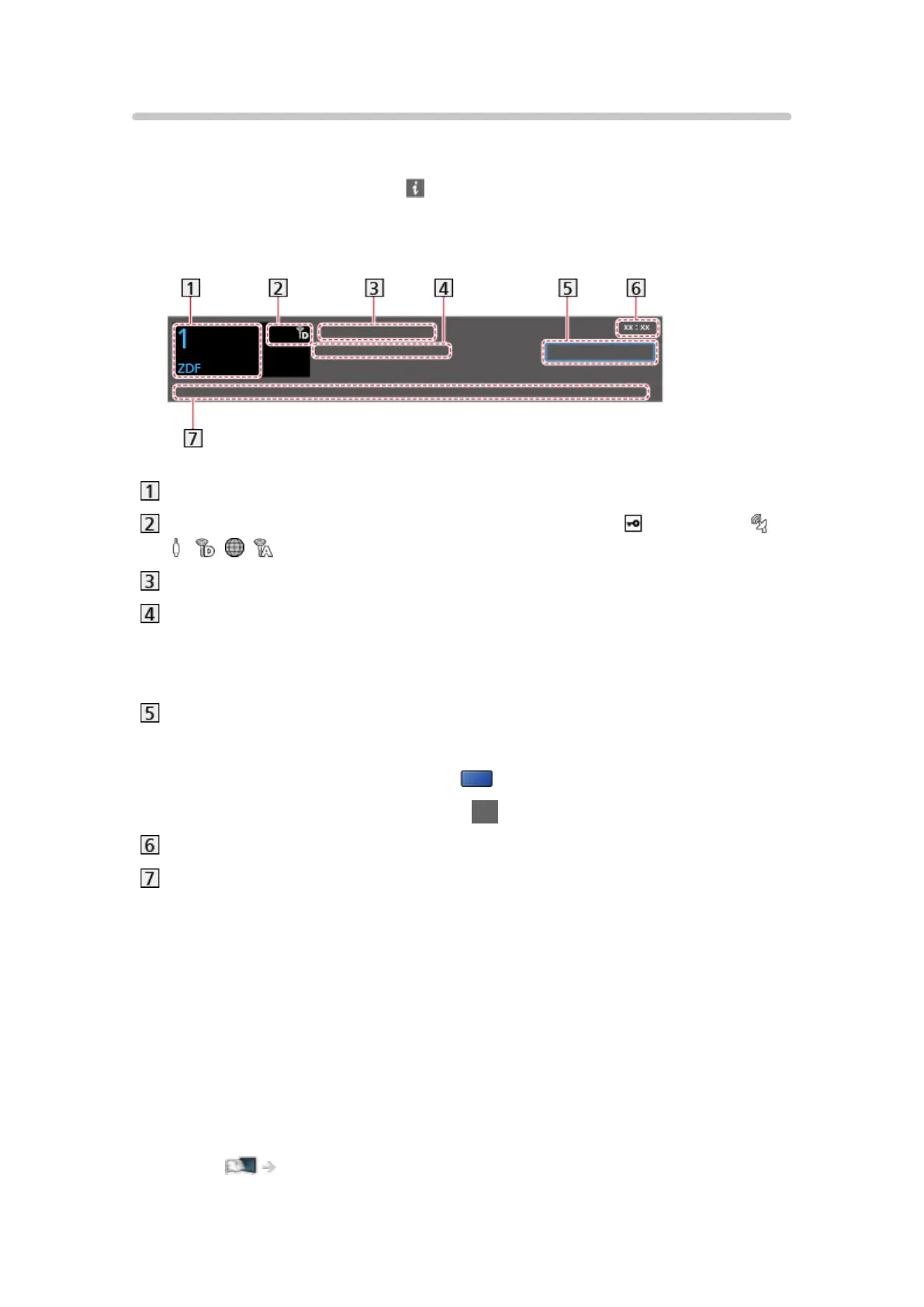 Channel type (Radio, HDTV, etc.) / Encrypted channel ( ) / TV mode ( ,