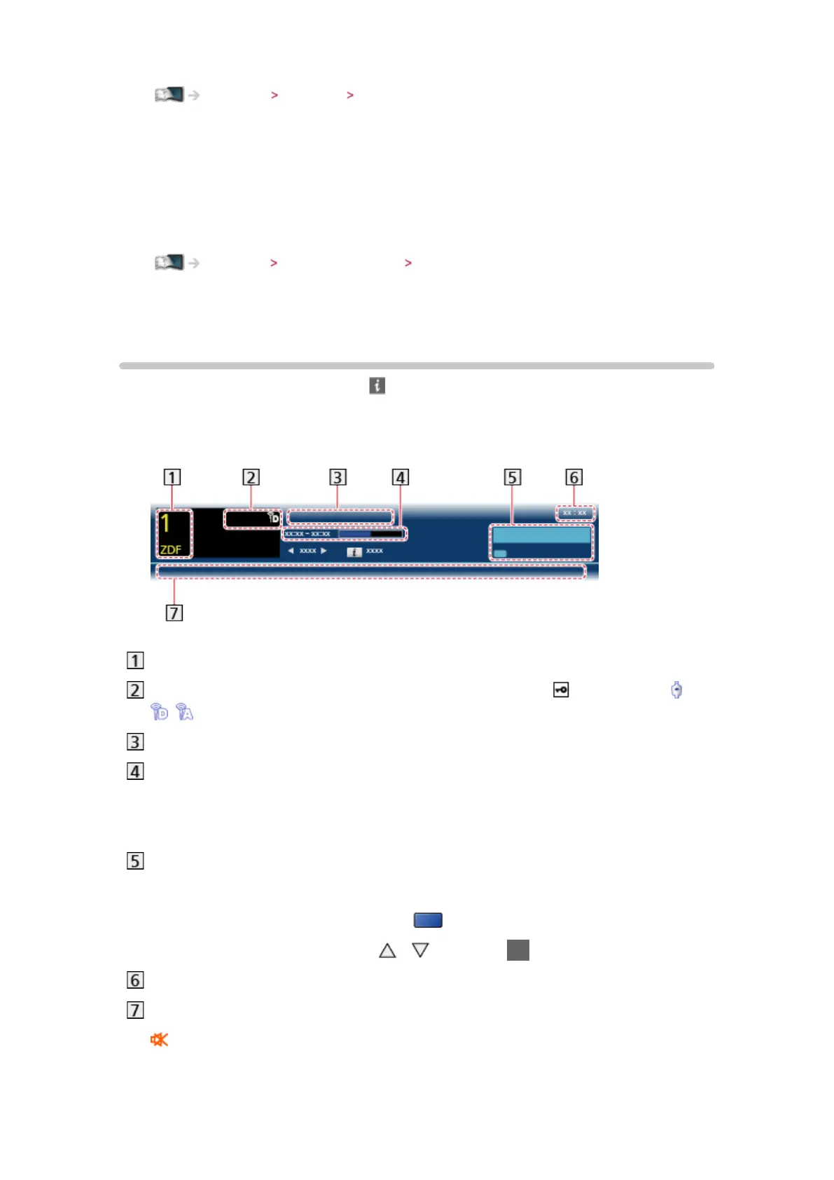 Channel type (Radio, HDTV, etc.) / encrypted channel ( ) / TV mode ( ,