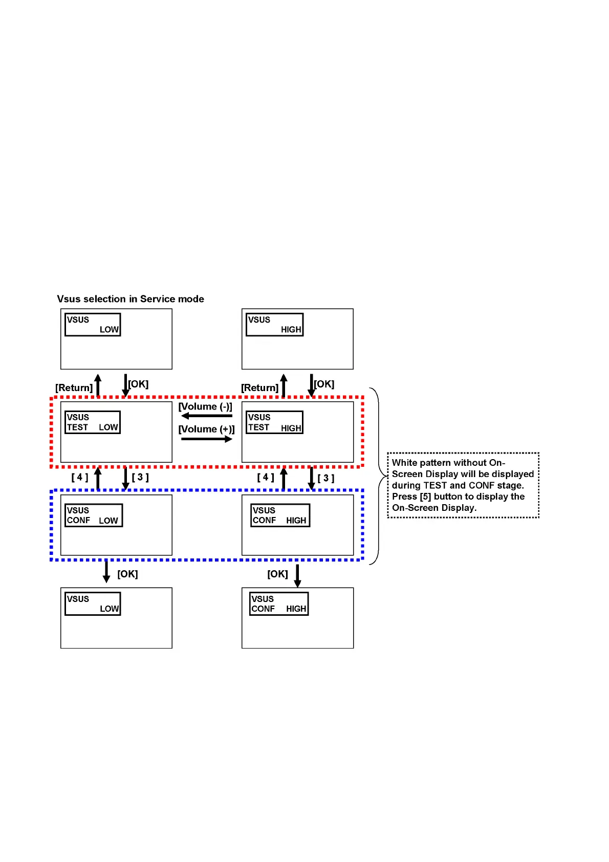 White pattern without On-Screen Display will be displayed during TEST and CONF stage. Press [5] button to display the