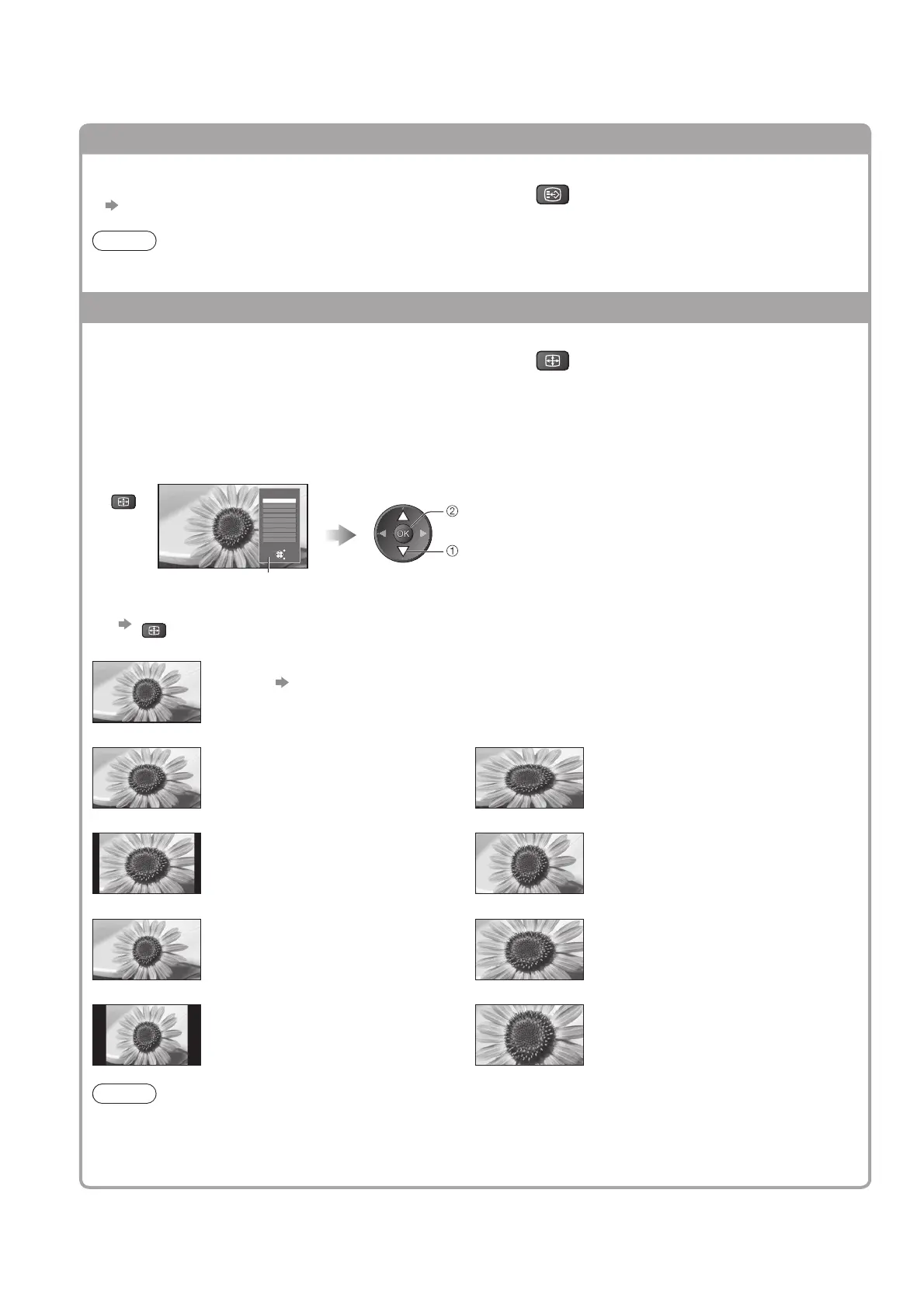 Aspect mode can be memorized separately for SD (Standard definition) and HD (High definition) signals.●