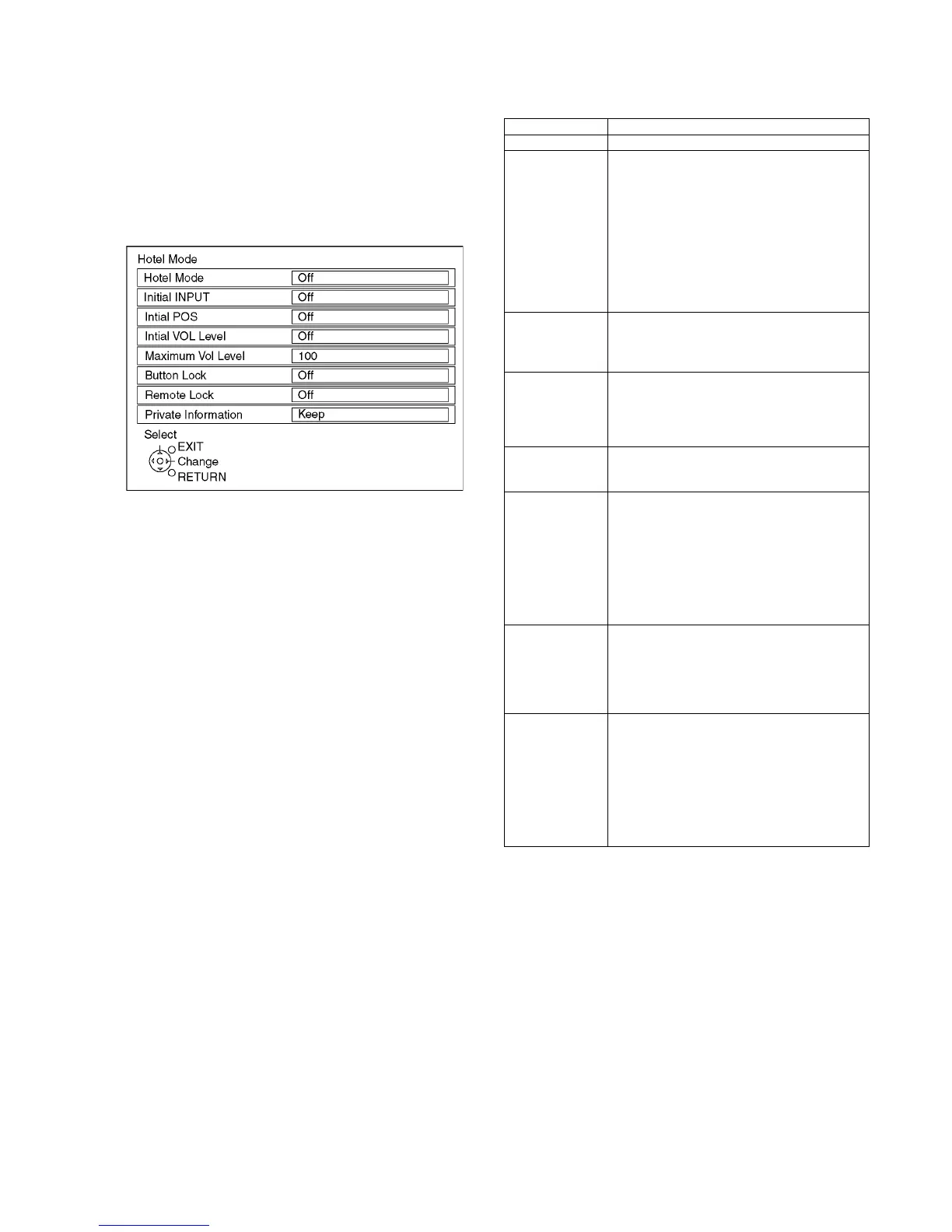 Hotel Mode Select hotel mode ON/OFF
