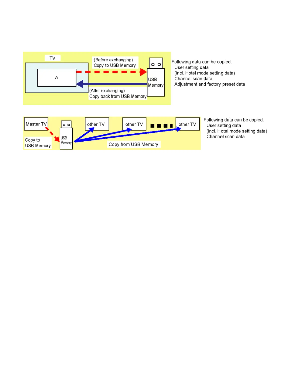 When installing a number of units in hotel or any facility, the data in master TV can be copied to USB Memory and then copy to other TVs.