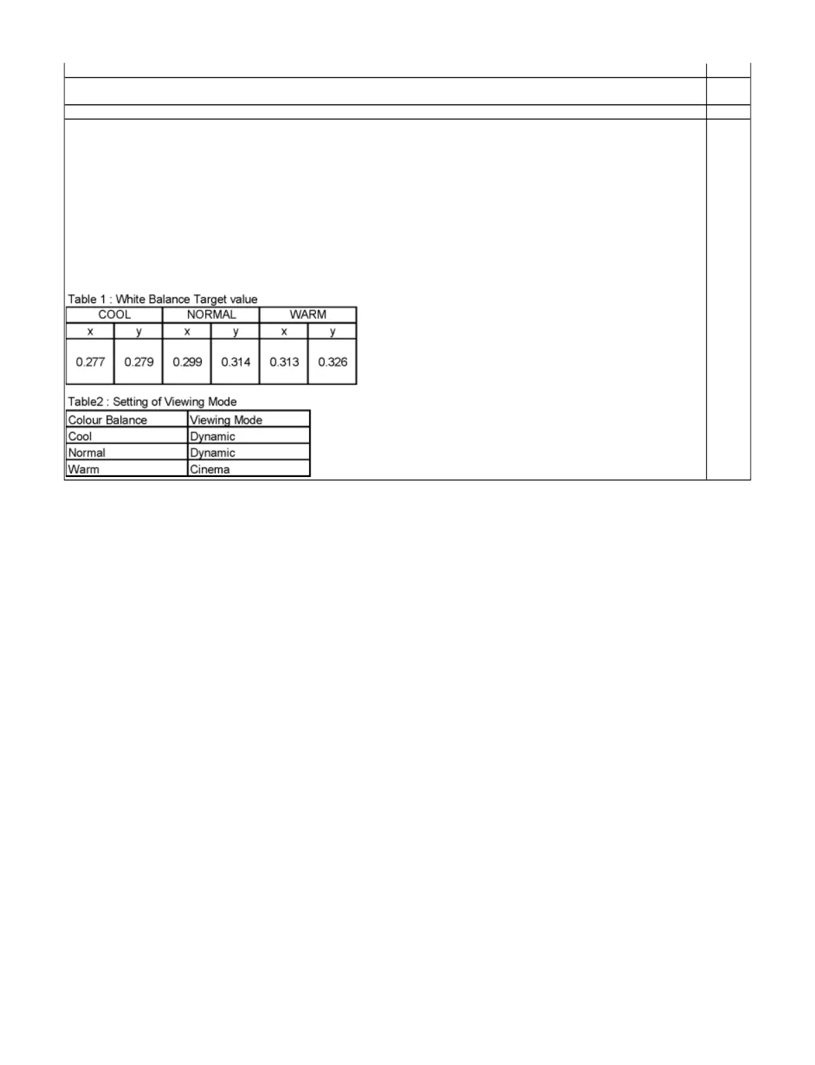 4. Check that the colour balance and the viewing mode is the values written in table1 and 2.