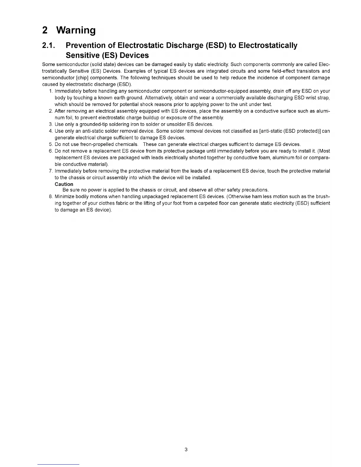 8. Minimize bodily motions when handling unpackaged replacement ES devices. (Otherwise ham less motion such as the brush