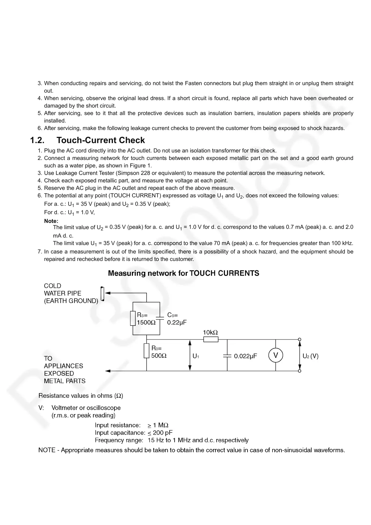6. After servicing, make the following leakage current checks to prevent the customer from being exposed to shock hazards.