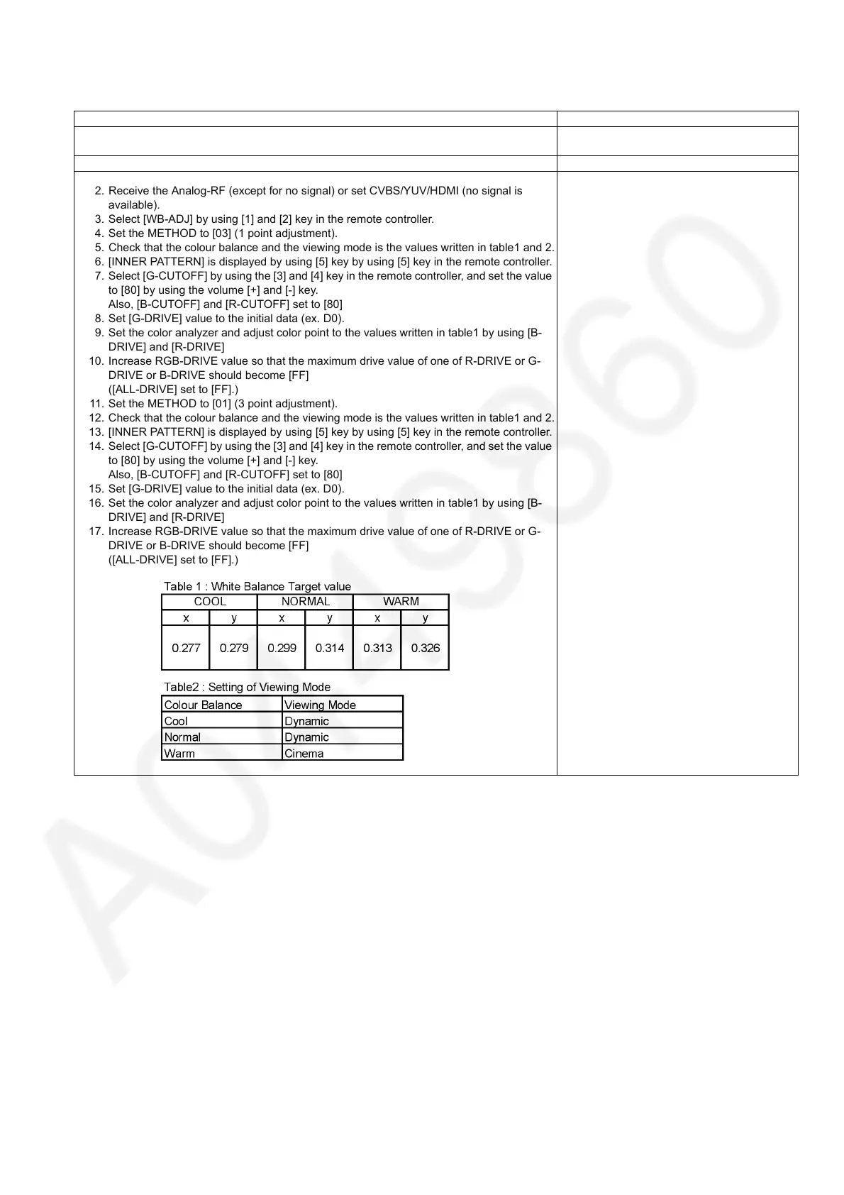 12. Check that the colour balance and the viewing mode is the values written in table1 and 2.