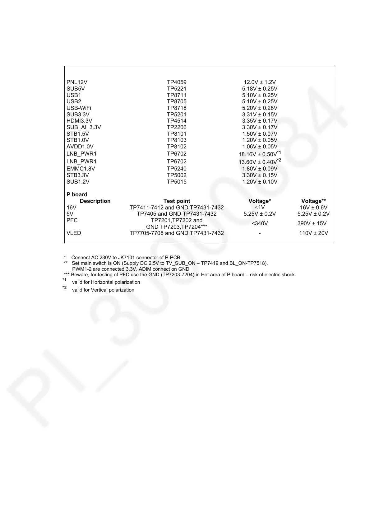 *** Beware, for testing of PFC use the GND (TP7203-7204) in Hot area of P board – risk of electric shock.