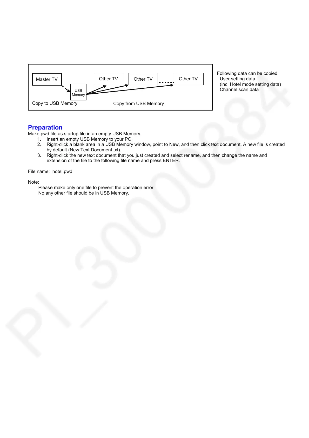 When installing a number of units in hotel or any facility, the data in master TV can be copied to USB Memory and the copy
