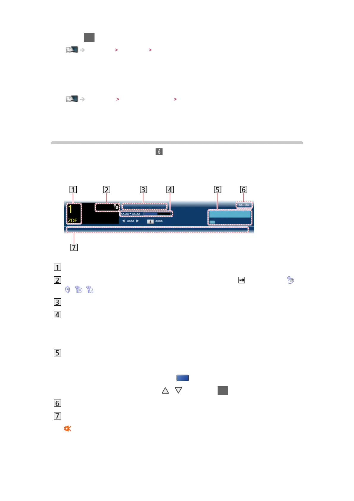 Channel type (Radio, HDTV, etc.) / encrypted channel ( ) / TV mode ( ,