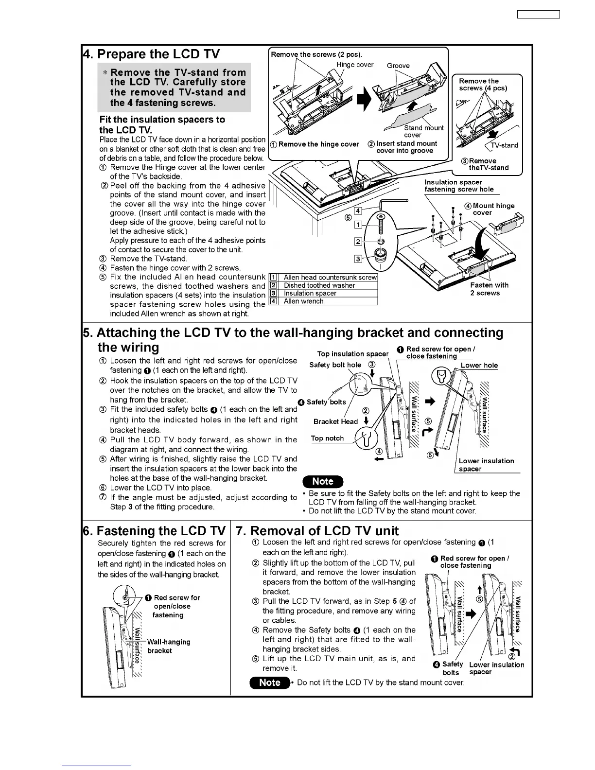 Panasonic TY-WK32LR2W - Prepare the Lcd Tv; Attaching, Fastening and Removing LCD TV
