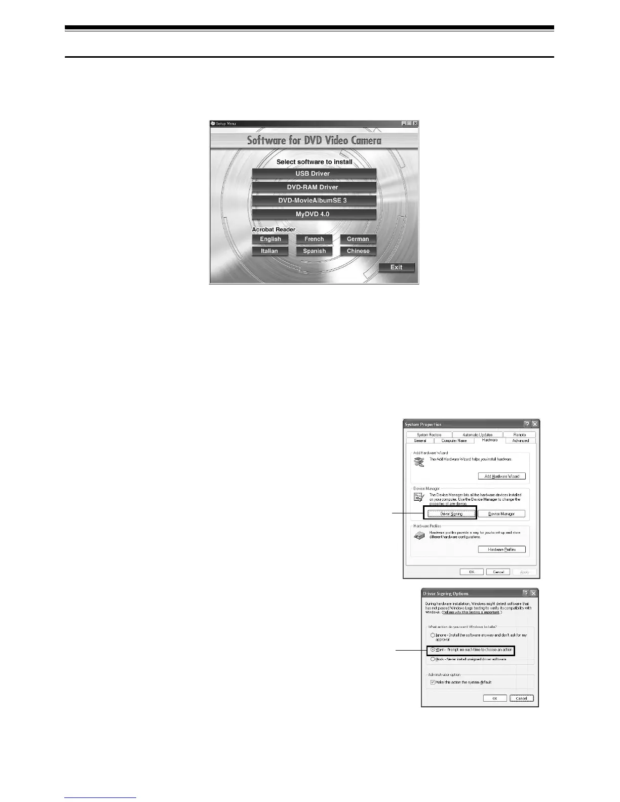 When “Driver Signing” is selected in the “Hardware” tab in