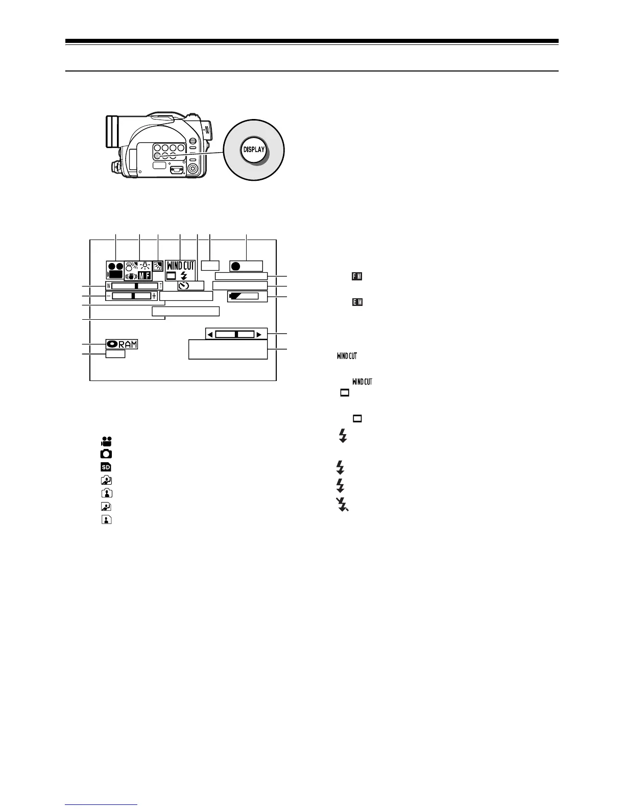 Various types of information will appear in the viewfinder or on the LCD screen during recording.