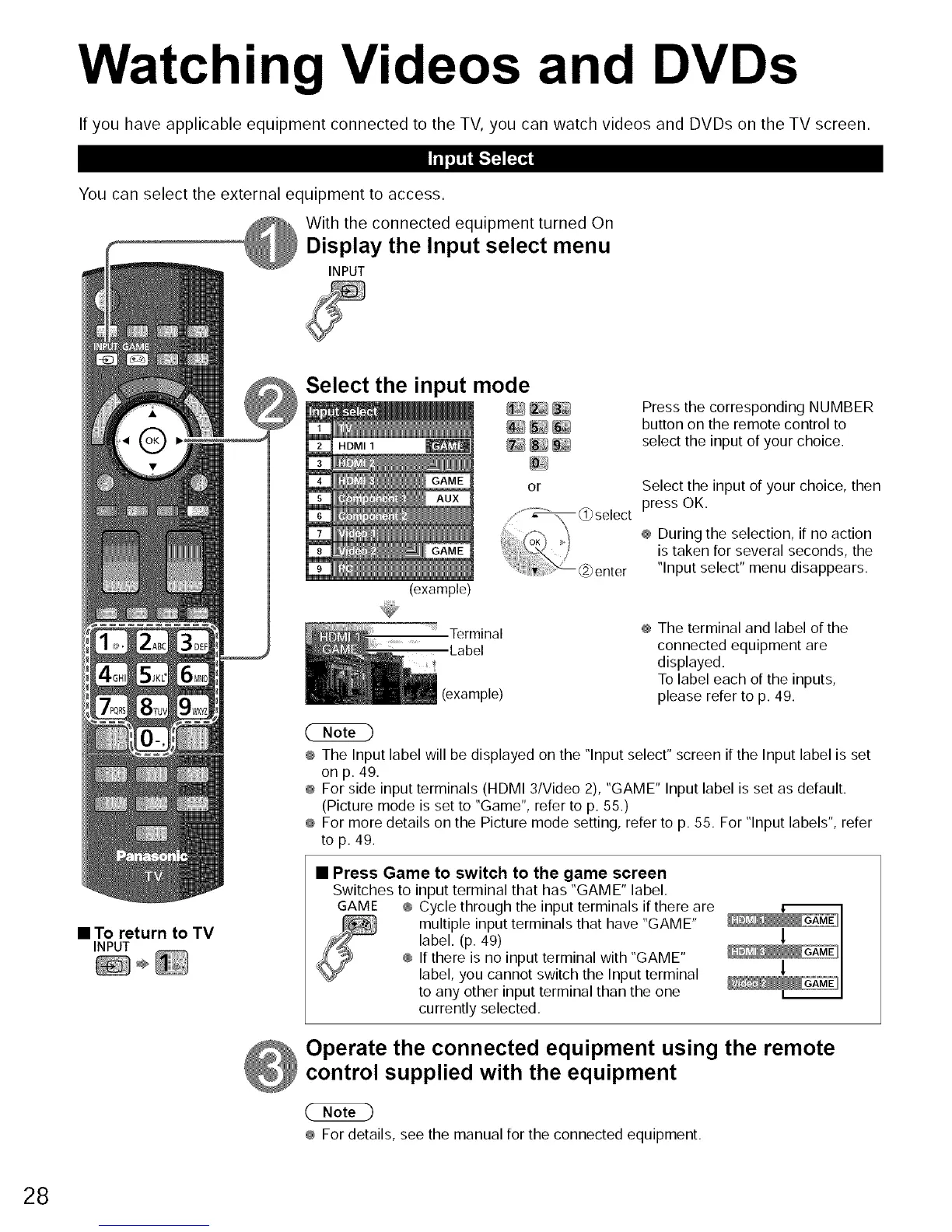 ® For side input terminals (HDMI 3/Video 2), "GAME" Input label is set as default.