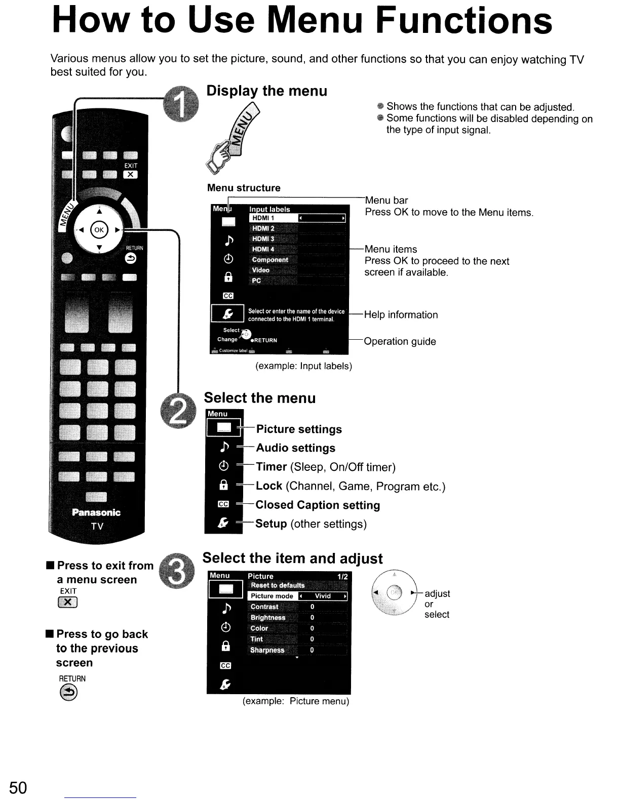 Various menus allow you to set the picture, sound, and other functions so that you can enjoy watching TV