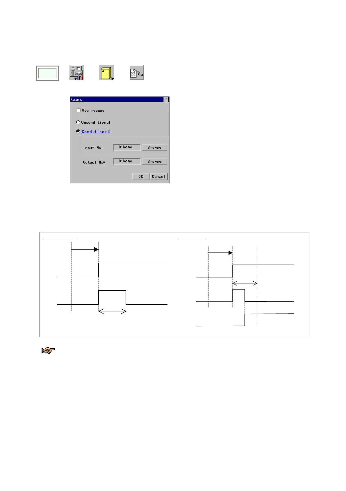 If conditions are specified, input signal is accepted while the resume output is ON. And once the input signal is