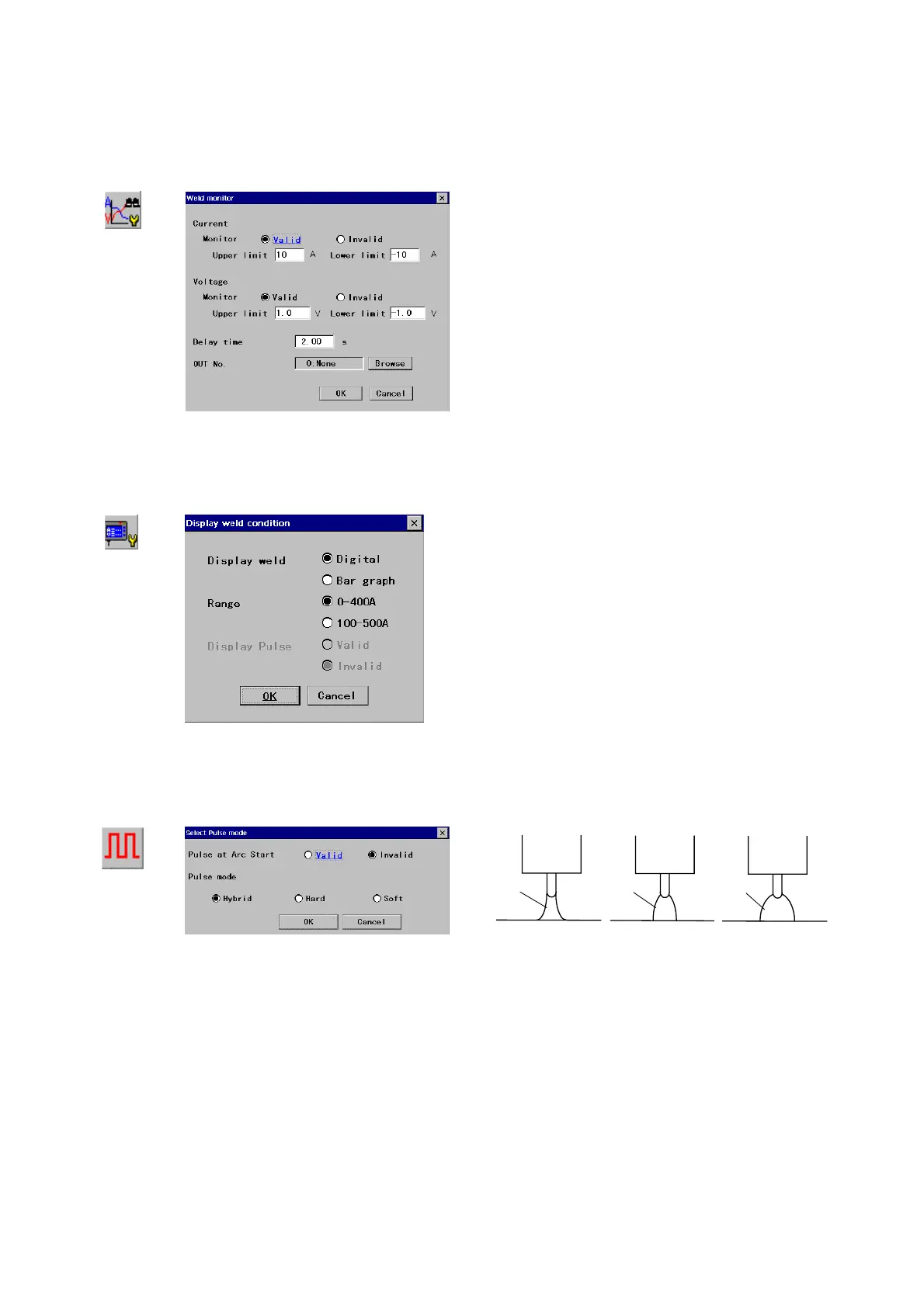 It monitors whether the actual welding conditions are within the set ranges or not. This function is useful to maintain and