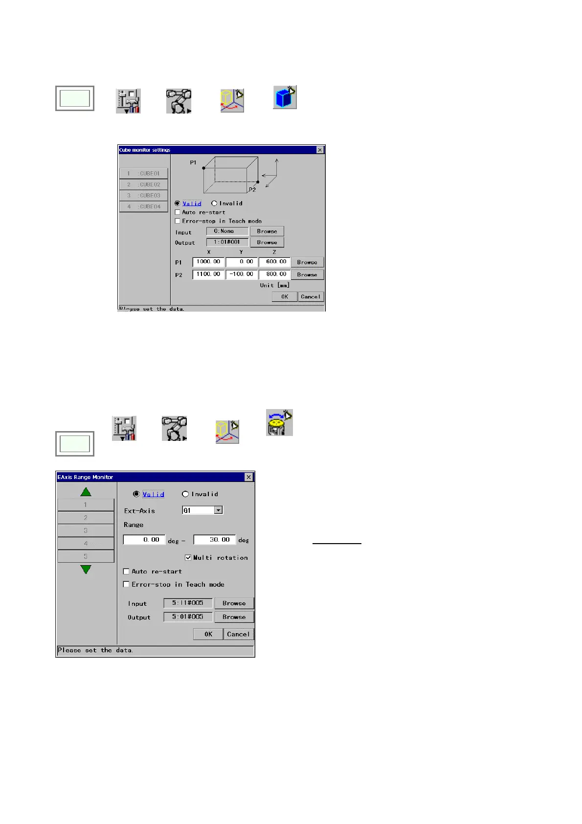 Cube monitor, it is possible to bring the robot to an error stop before the external axis enters the specified area.