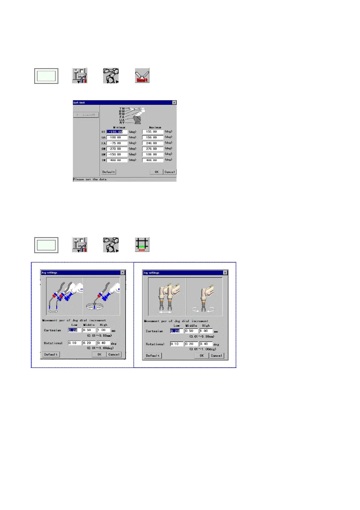 “Jog” is a type of operation to move the robot a little at a time. The “Jog settings” is to set the robot travel amount