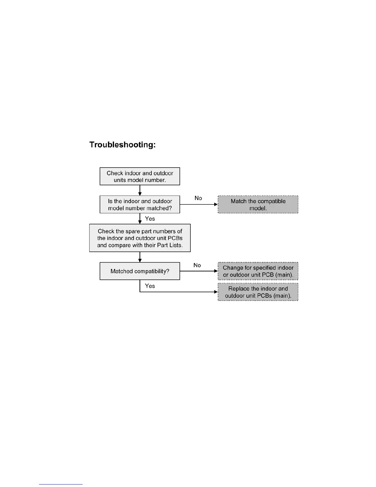 2. Wrong indoor unit or outdoor unit PCB (main) used.