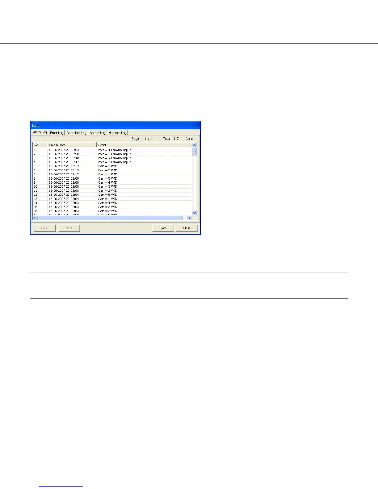 It is possible to check the alarm log, error log, operation log, access log and network log of the recorder.