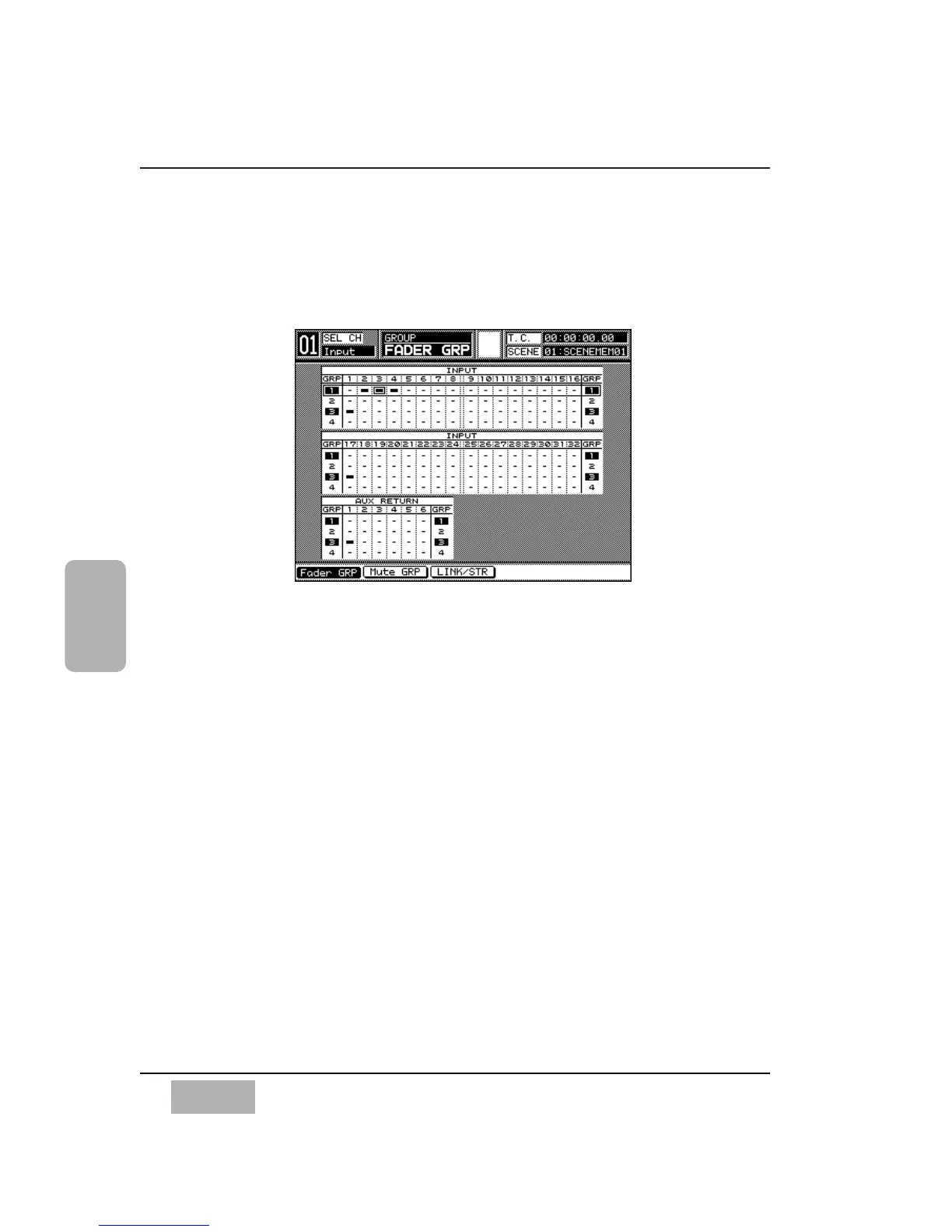 Use the [FADER GRP] window to select channels to a group so that multiple