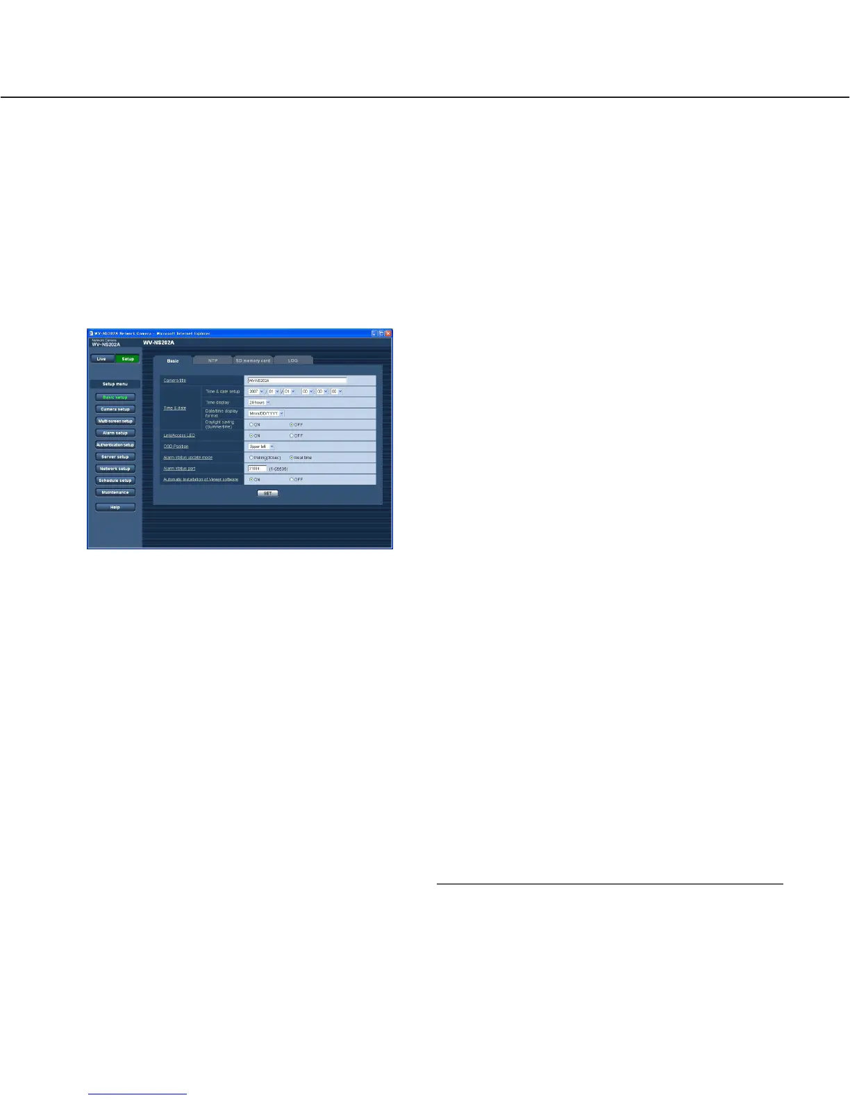 The basic settings such as time and date and camera name, and the settings relating to the NTP server and the SD