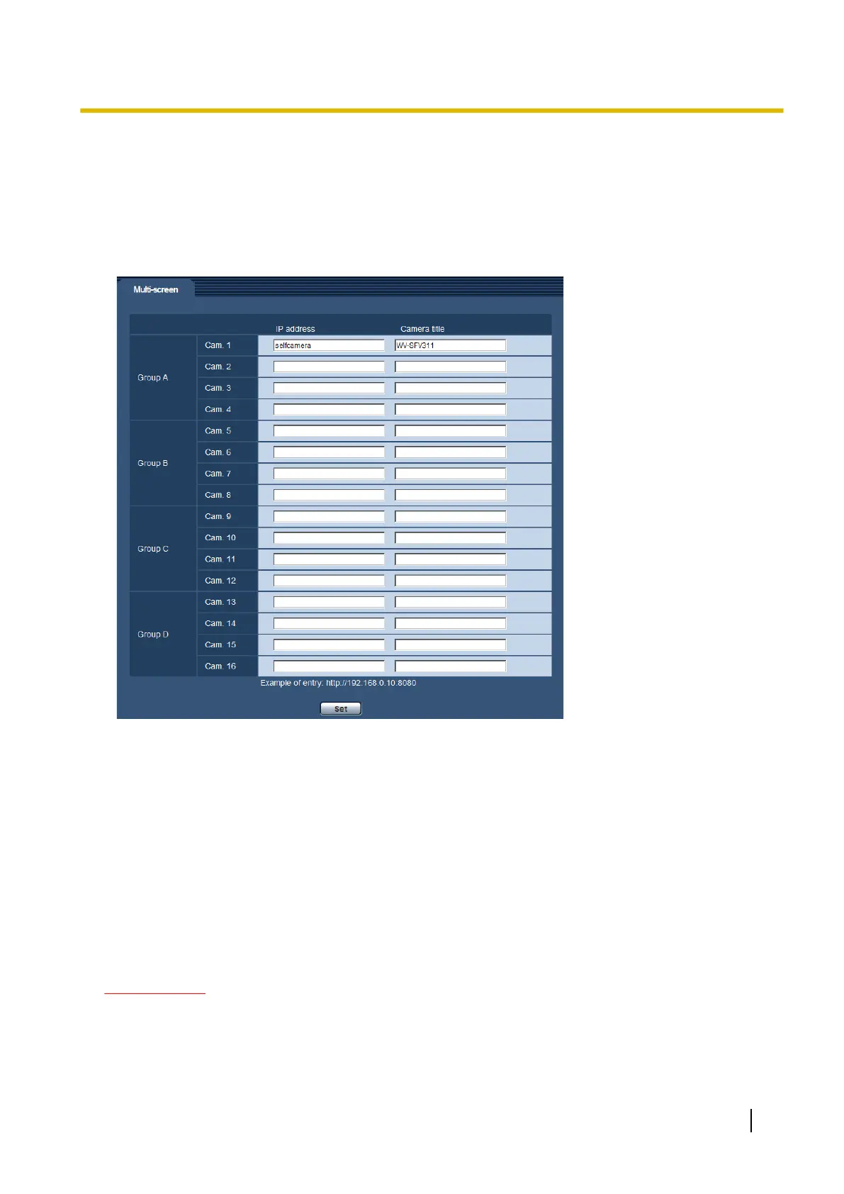 Enter the IP address or the host name of the camera to be used for the multi-screen. 4 cameras can be