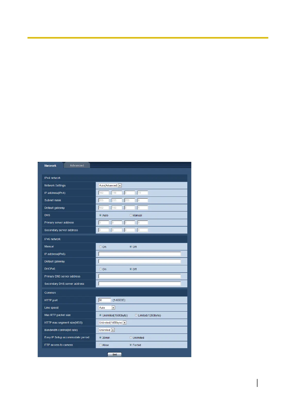 The “Network” page has the [Network] tab and the [Advanced] tab.