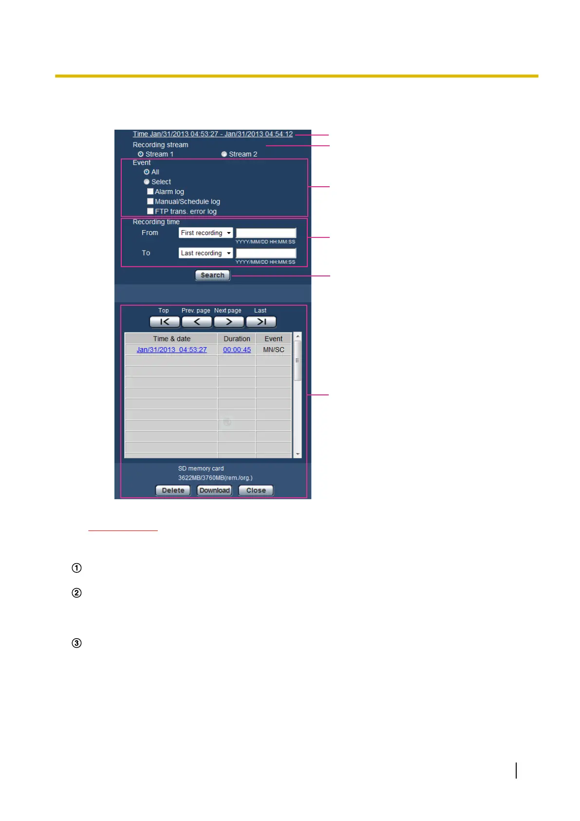 • Stream 1: The logs recorded by “Recording stream 1” on the [SD memory card] tab will be displayed.