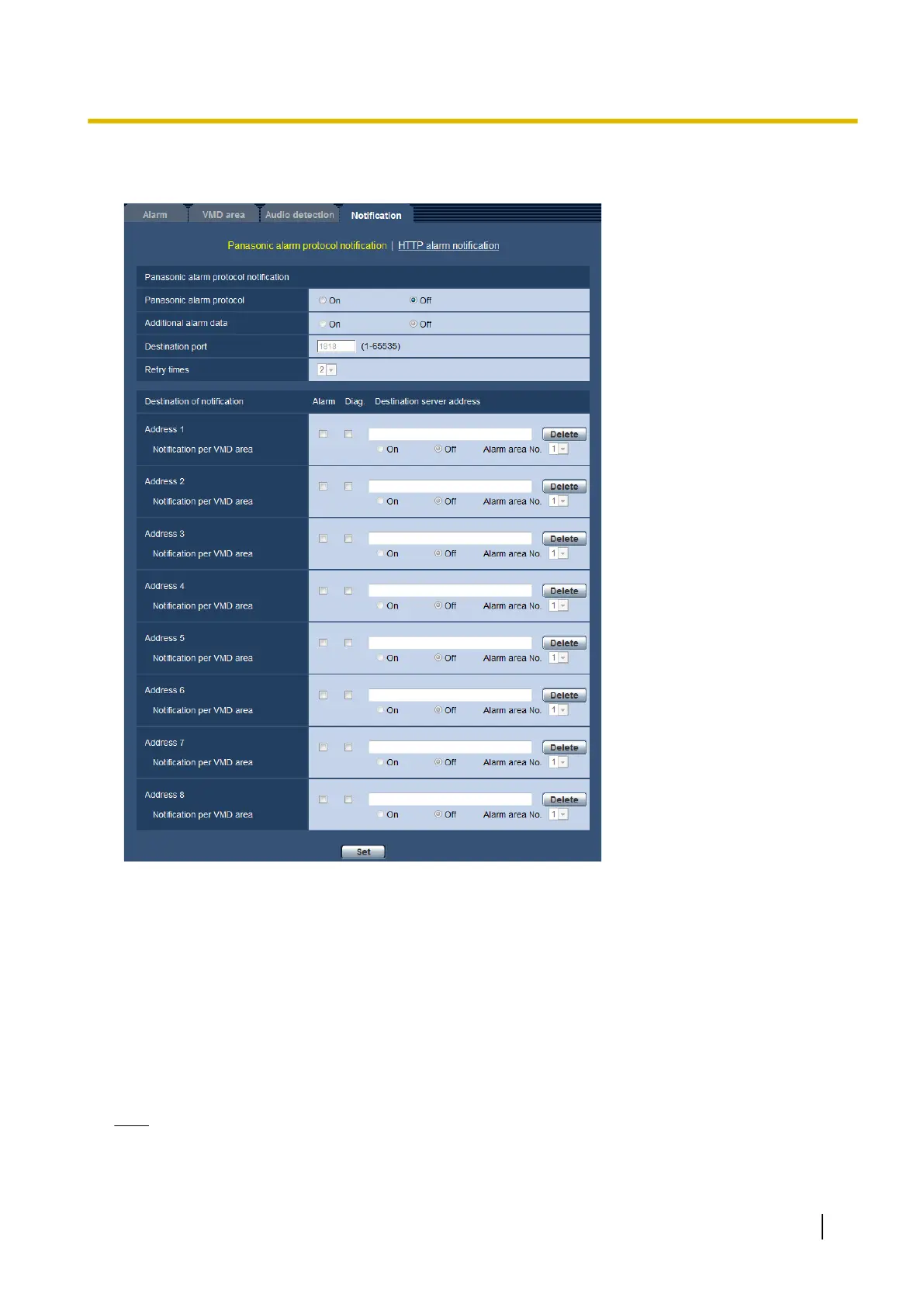Select “On” or “Off” to determine whether or not to provide notification by Panasonic alarm protocol according