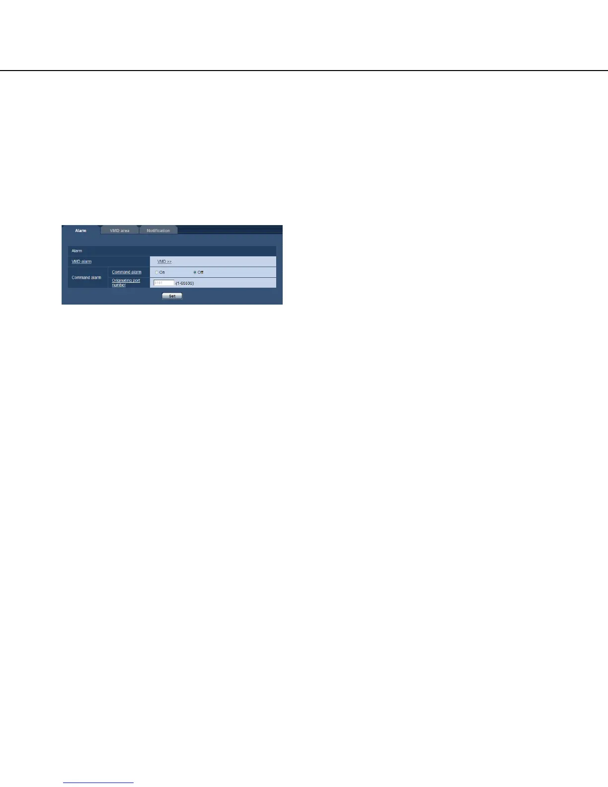 The"Alarm"pagehas3tabs;the[Alarm]tab,the[VMDarea]tabandthe[Notification]tab.