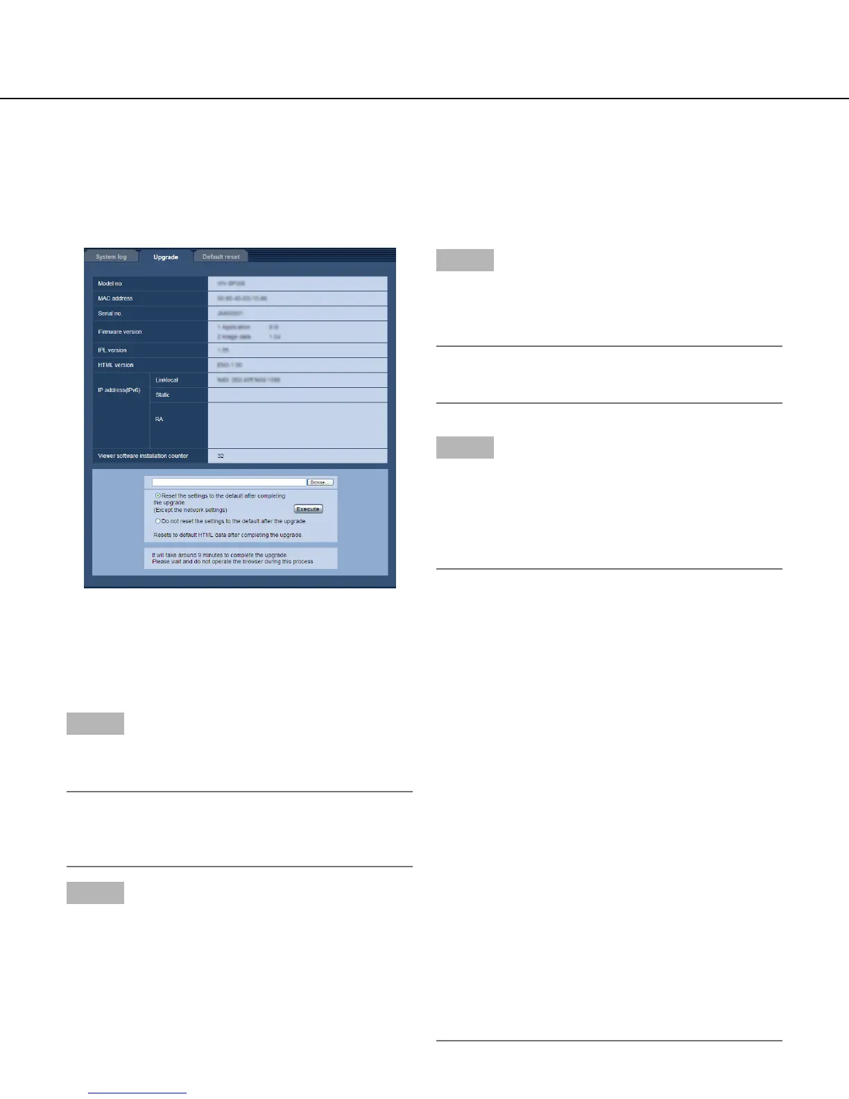 Click the [Upgrade] tab of the "Maintenance" page. (☞Pages13and14:Howtodisplay/operatethesetupmenu)