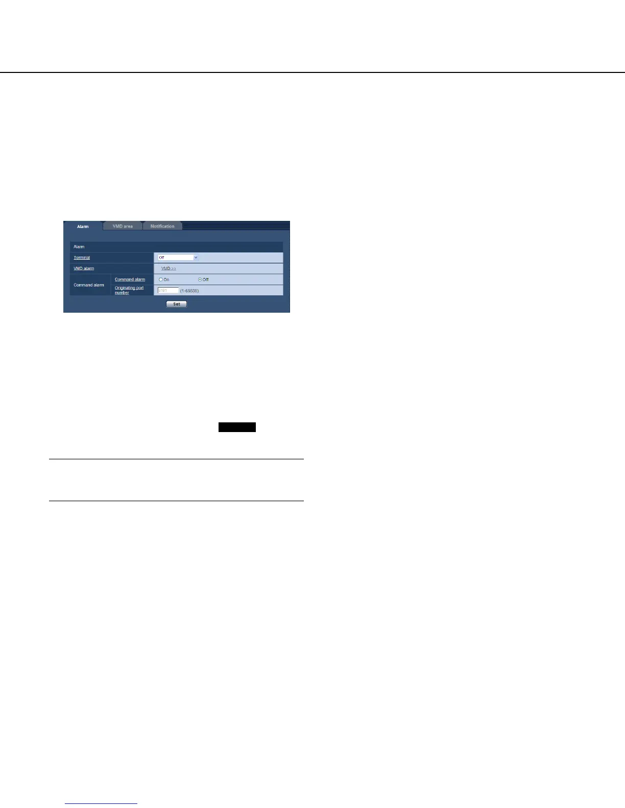 The "Alarm" page has 3 tabs; the [Alarm] tab, the [VMD area] tab and the [Notification] tab.