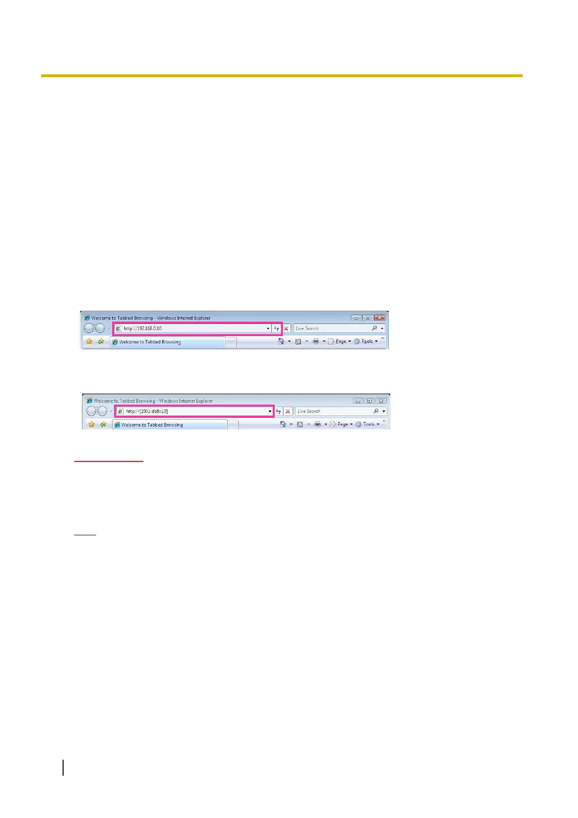 • Example when entering an IPv6 address: http://[URL registered using IPv6 address]