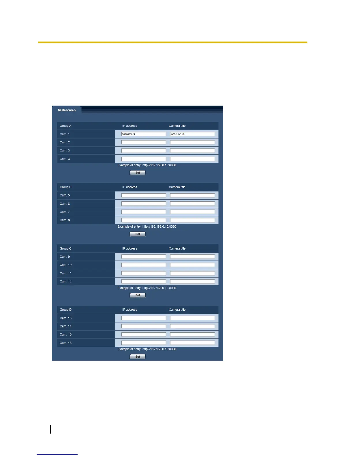Enter the IP address or the host name of the camera to be used for the multi-screen. 4 cameras can be