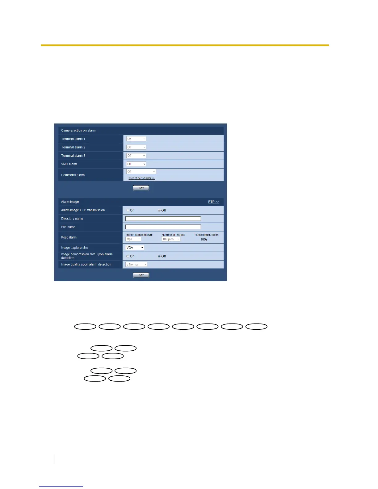 The settings relating to the camera action at an alarm occurrence can be configured in this section. Refer to