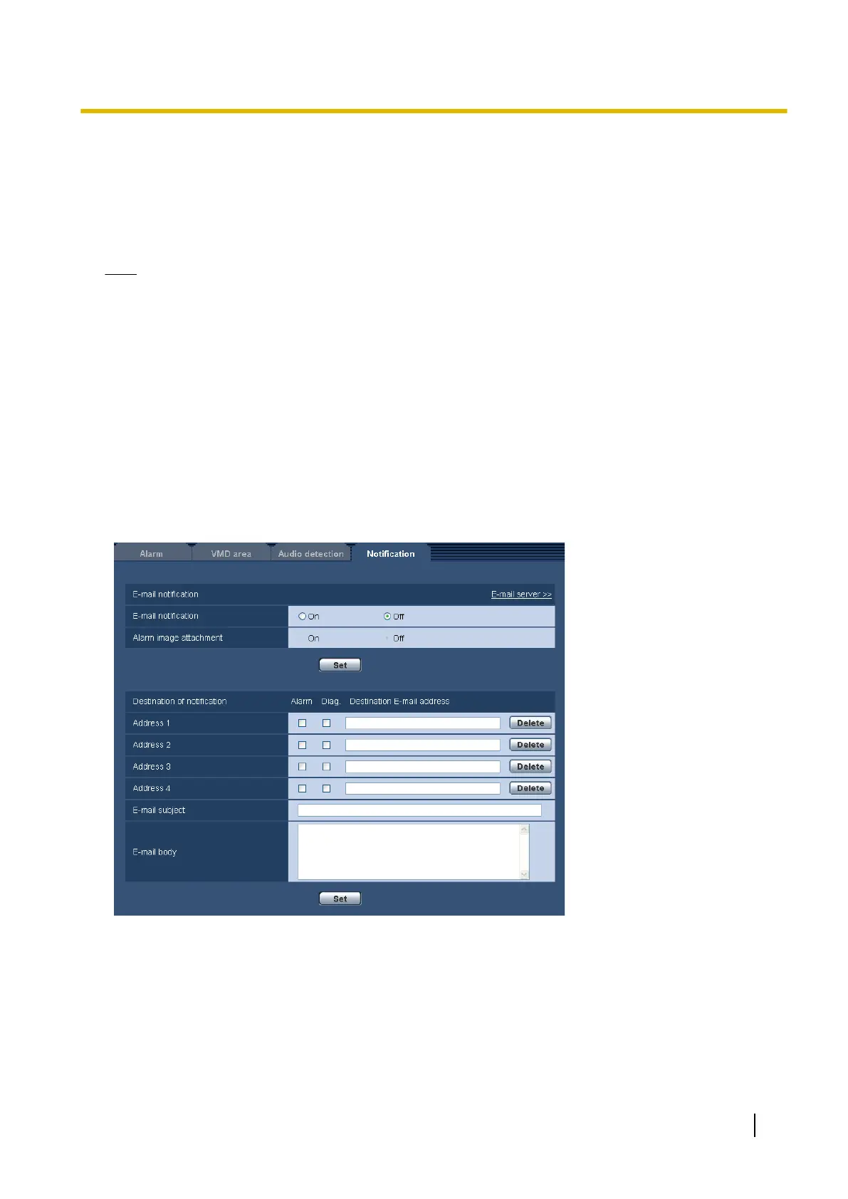 Click the [Notification] tab on the “Alarm” page. (®page 47, page 49)