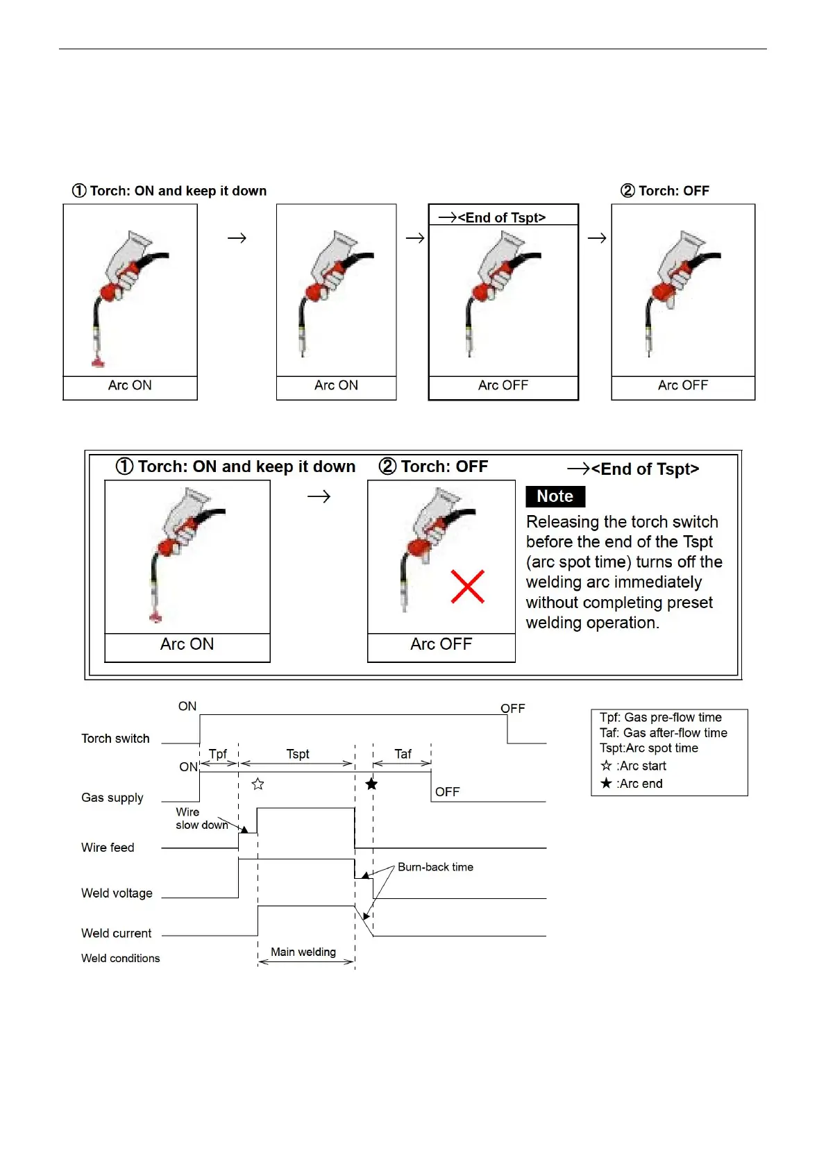 If the torch switch is released while generating the welding arc (before Tspt ends), the welding arc is turned off