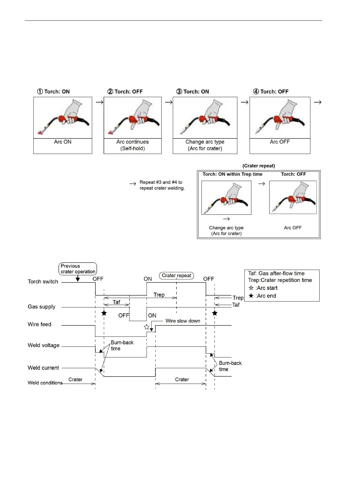 To repeat crater operation turn ON the torch switch within a preset time (Trep)* after turning off the previous crater