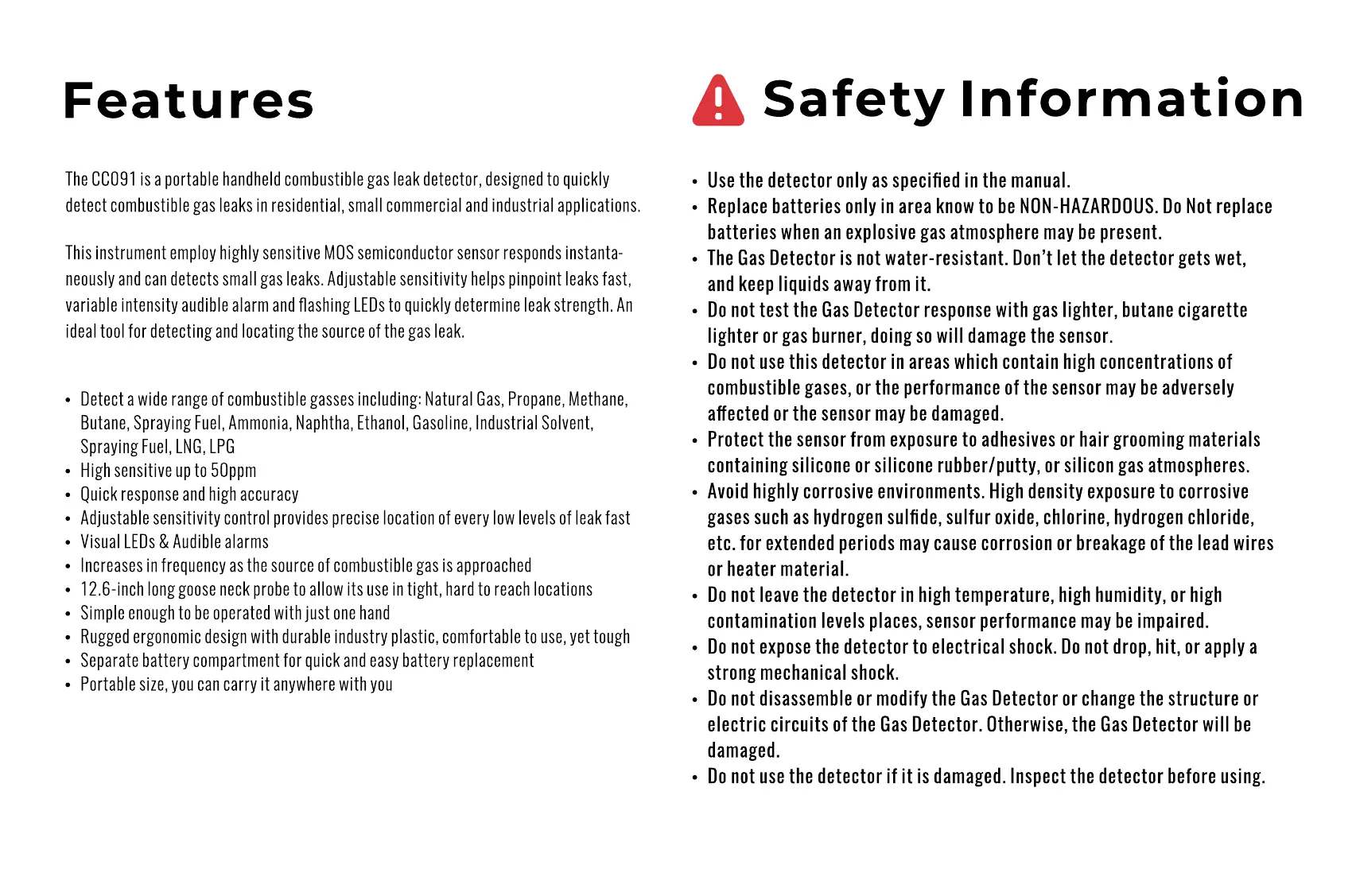 PANBUDOR CC091 - Features; Safety Information