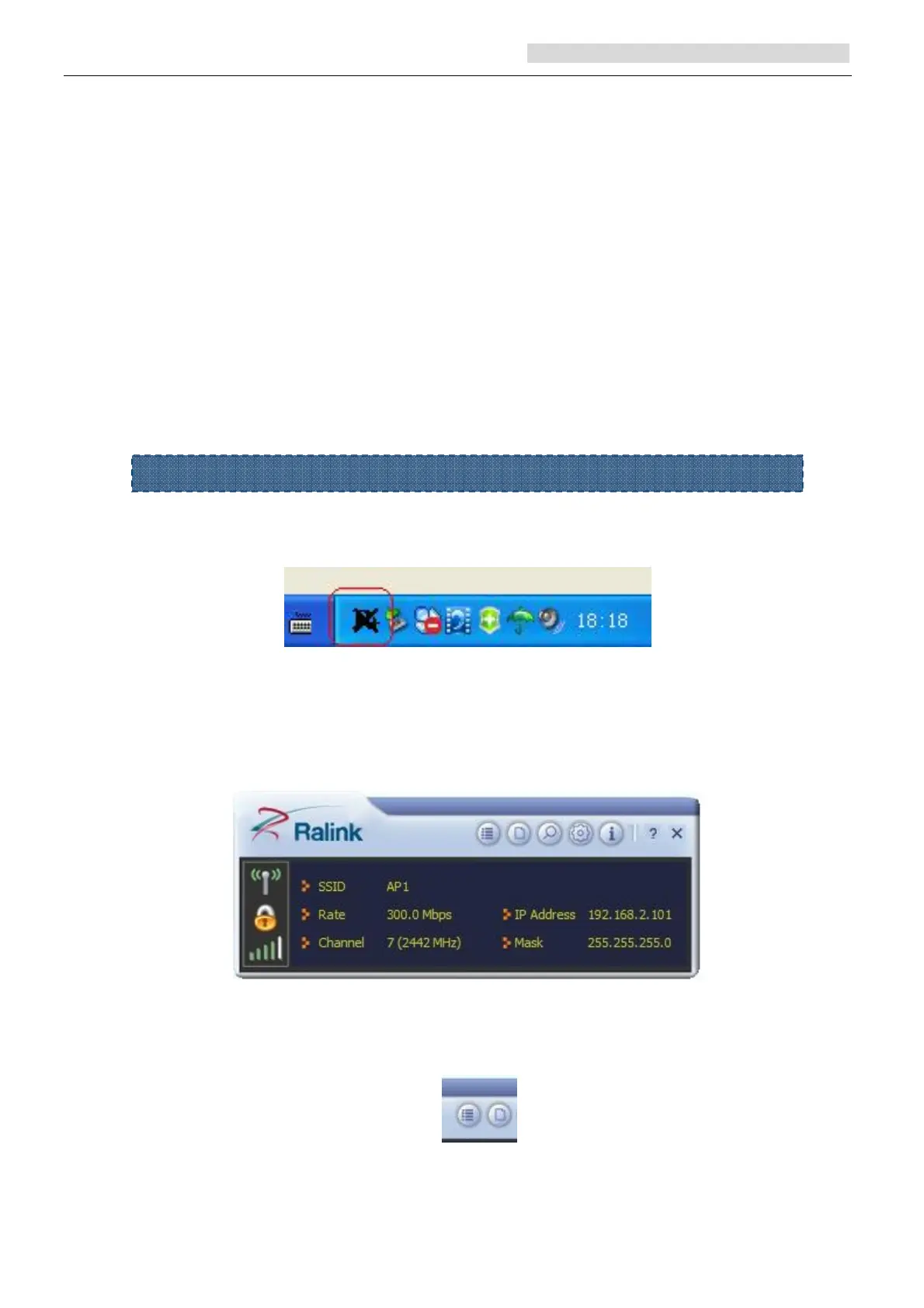 After the installation of Ralink utility, the system shows a special wireless utility icon in the