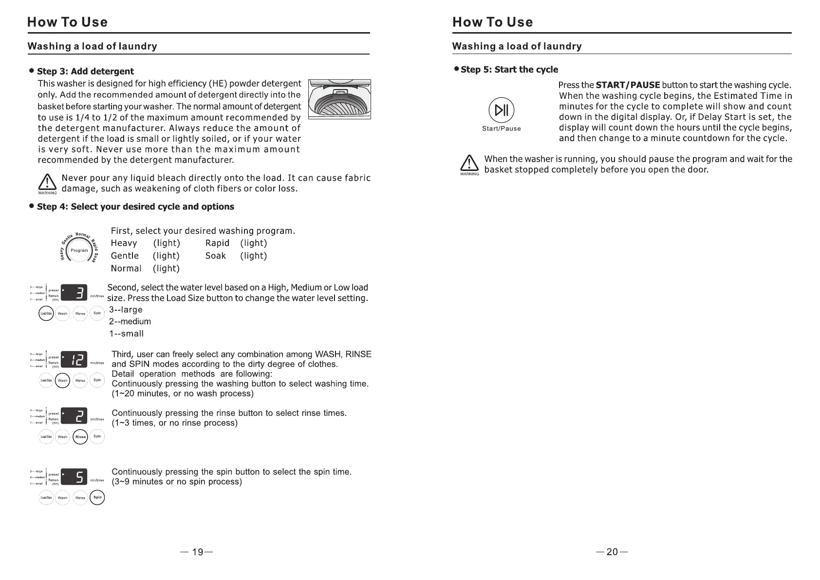 Panda PAN30SW - Adding Detergent for Washing; Selecting Wash Cycles and Options; Starting the Wash Cycle