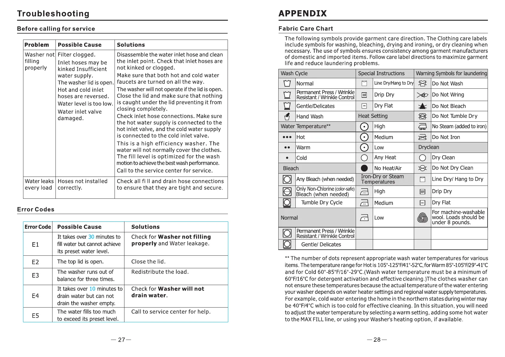 Panda PAN30SW - Advanced Troubleshooting Steps; Error Codes Explained; APPENDIX; Fabric Care Chart